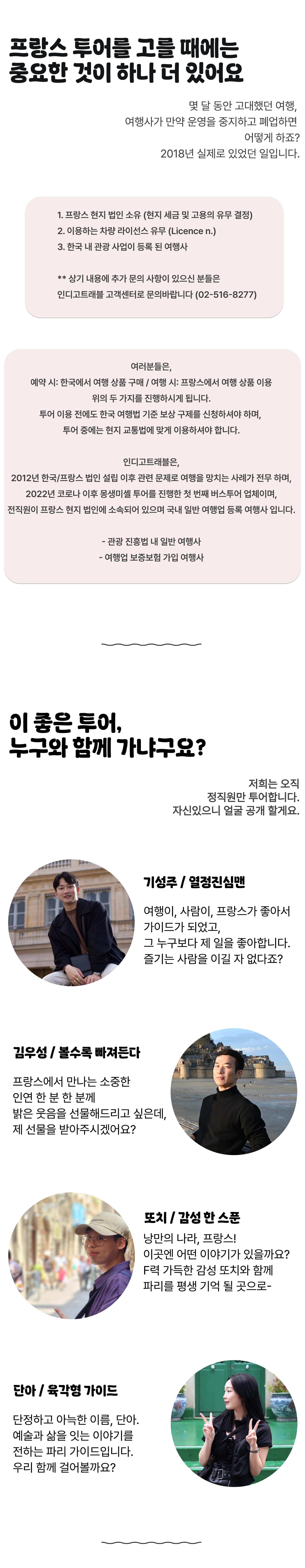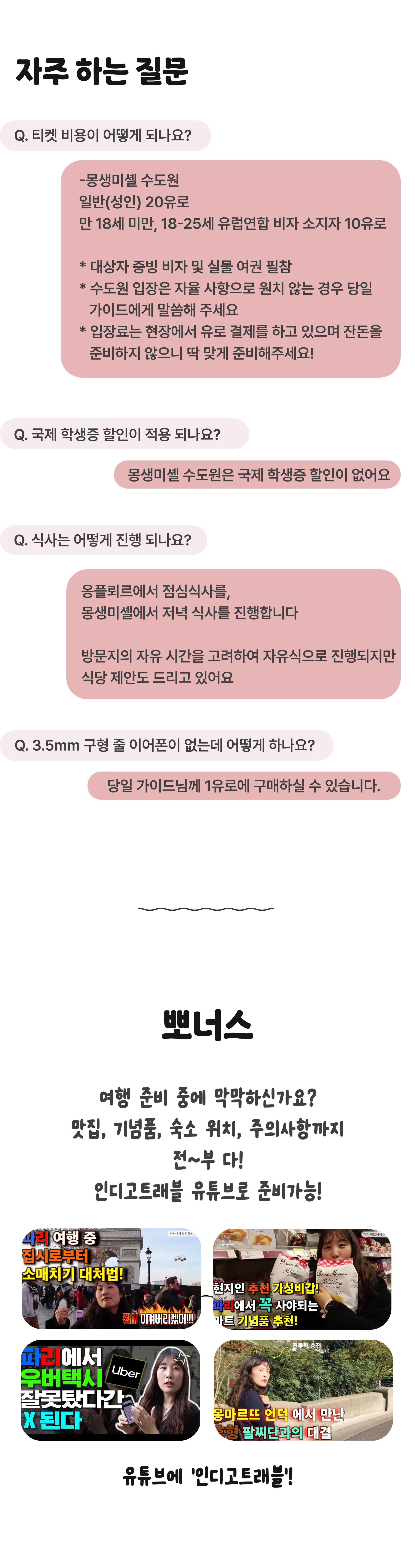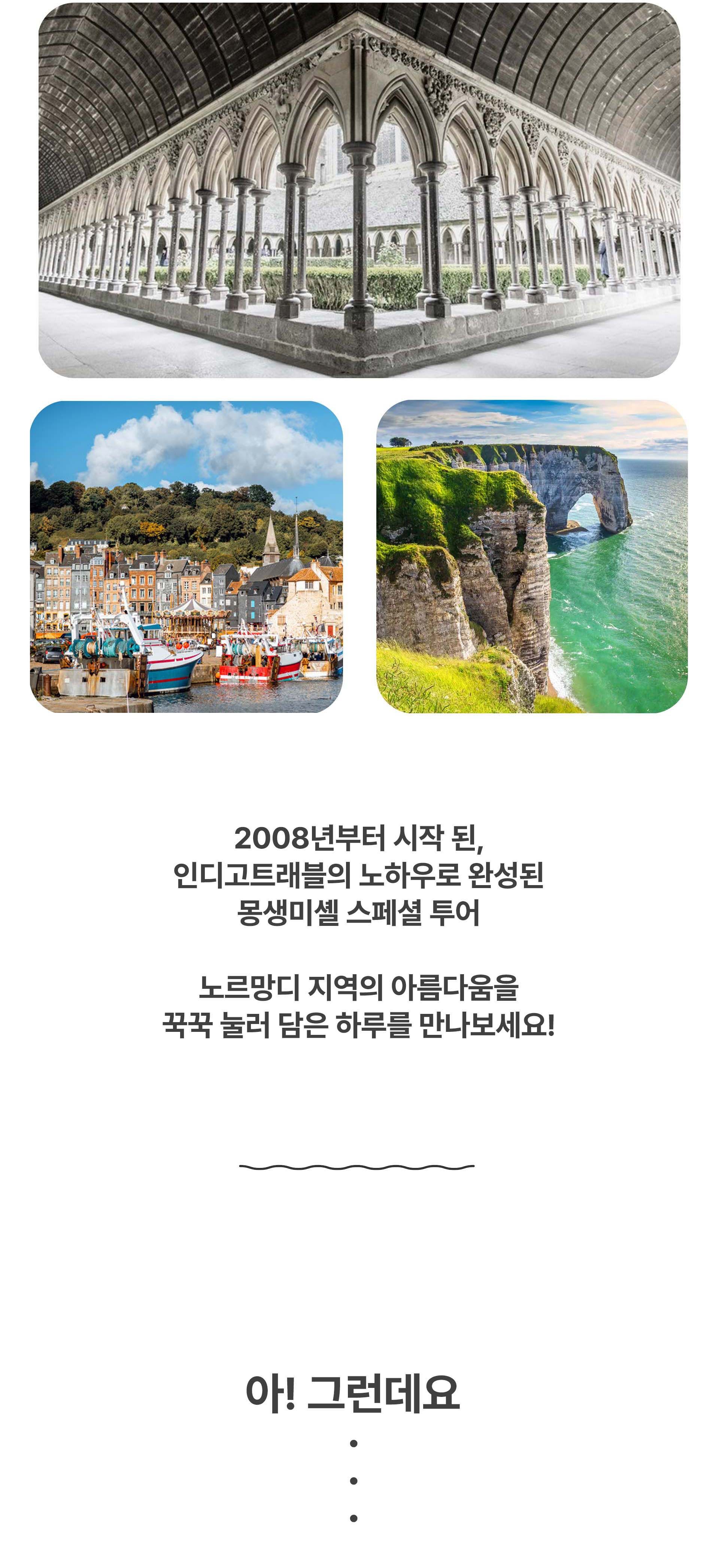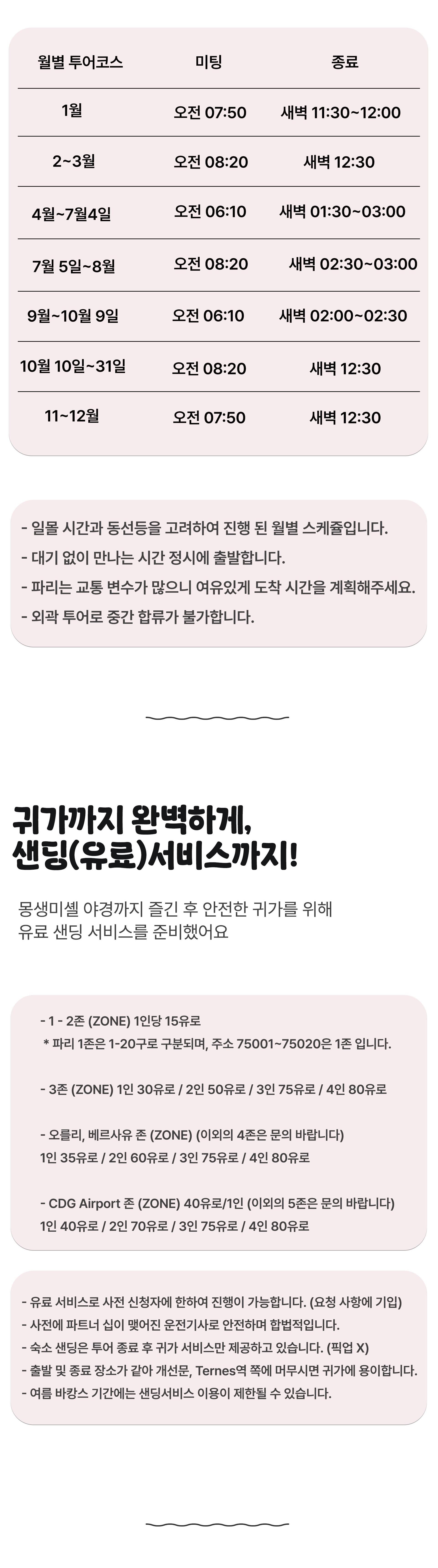 ★ 매년 프랑스 바캉스 기간에는 샌딩 서비스 이용이 어려울 수 있습니다. (24년 8월 8일 ~ 20일) * 최소 출발 인원은 5인 입니다. 최소 출발 인원 미달 시 취소될 수 있습니다. 해당 경우에는 투어일 기준 최소 7일 전까지 날짜 변경 제안 또는 전액 환불을 진행합니다 - 방문지의 파업이나 공사 등의 문제로 인해 내부 동반 입장 또는 방문이 불가한 경우에는, 환불이 불가하며 최대한 일정 내 가능한 대안 일정으로 안내 드립니다. (매년 9월 21일과 22일은 세계문화유산의 날로 수도원 투어가 불가합니다.