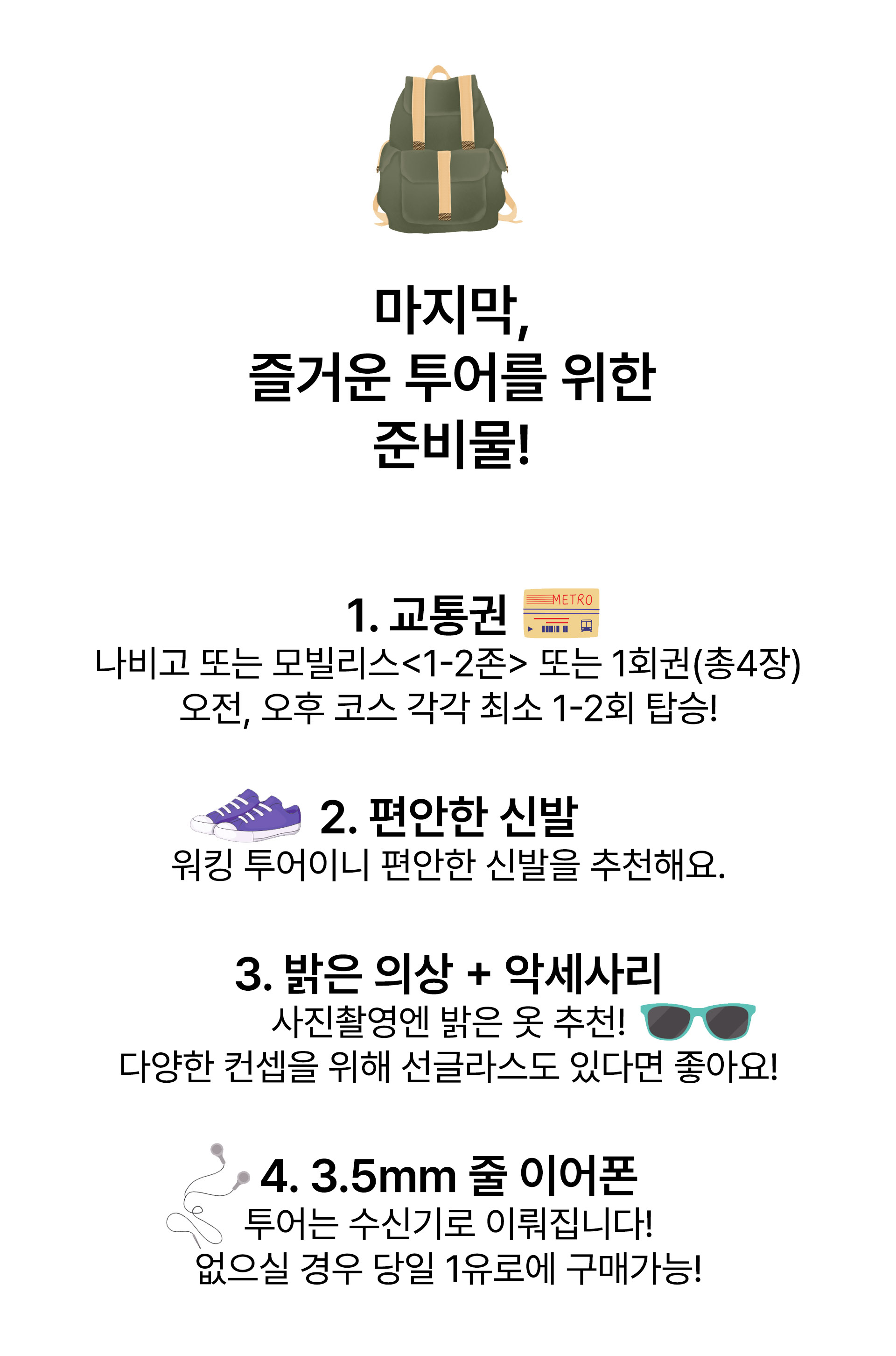 * 투어 종료 후 귀가 시 교통 상황은 예측이 어렵습니다. ‘투어 종료 후 지연 도착’의 경우는 보상을 하지 않습니다.